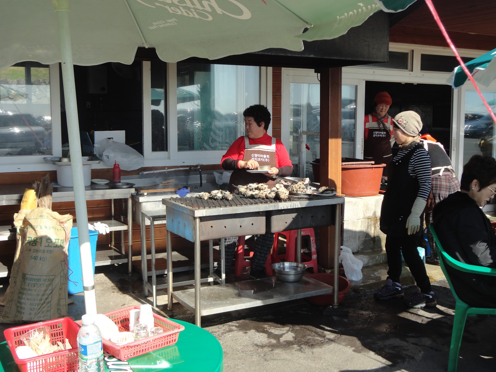 Seongsan Ichilbong Peak was the next stop. But we had so little time and I couldn't hike up to the peak. We took the shortest route and near the beach below there were women divers. Below, we had lunch at one of the shop and it also has a musolla (mix).